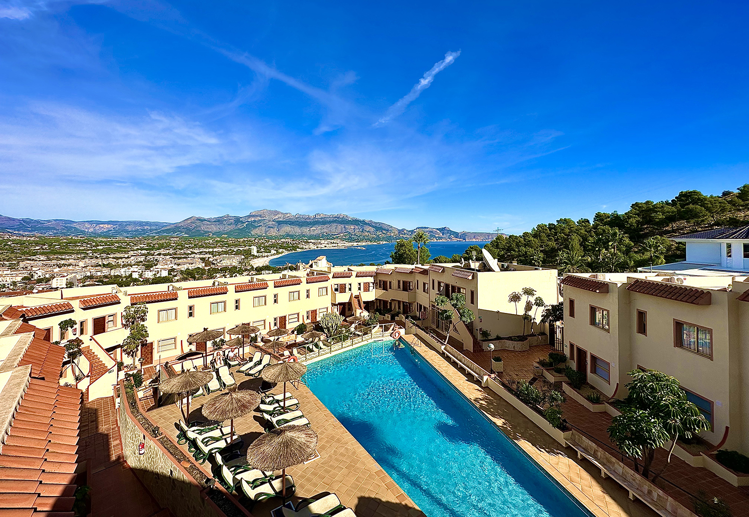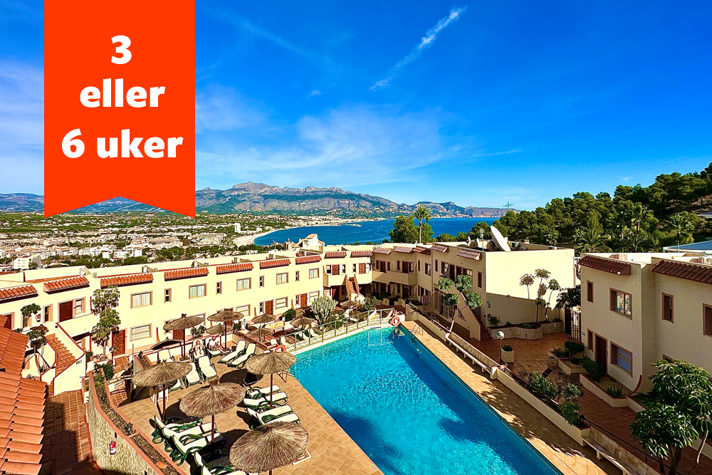 Vårt langtidshotell, Albir Hills, ligger på en høyde med utsikt til både strand og by. Flotte leiligheter med egen balkong, samt felles utendørsbasseng, velutstyrt treningsrom og boblebad. Mer om hotellet lenger ned på siden.