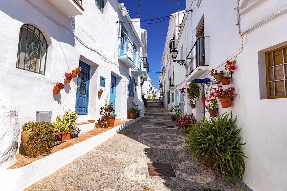 Etter frokost kjører vi nordøstover langs kysten. Frigiliana er en klassisk hvit landsby som er blitt kåret til Spanias vakreste flere ganger. Hvitkalkede hus og smale gater der blomster i alle regnbuens farger duver utover veggene, og gjør sitt til at svært mange turister forelsker seg i den lille fjellandsbyen.