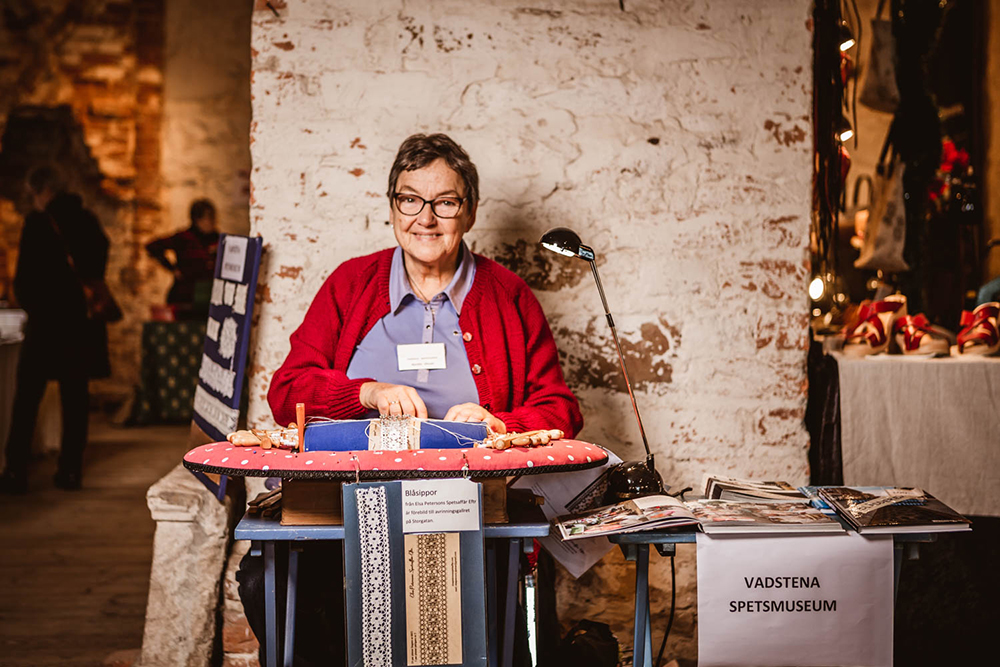Vakker pynt i halm og never, nydelige linduker, varme votter i ull og skinn og selvsagt kniplingene, som Vadstena er viden kjent for. Her kan du kjøpe julepynt til deg selv, om du vil, eller gjøre unna julehandelen. Det er også koselig å bare gå rundt og ta inn stemningen.